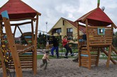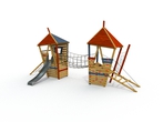 Doppelturm mit Rutsche, Brücke und NetzSeilaufstieg, Schrägaufstieg, Griff-Kletterwand, Seilbrücke, Seilspinnwebe, Rutsche, Versteck