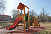 mehrzweck Kletterelement mit zwei Türmen und Rutsche2x Podest, Turm, Dach, Rutsche, Leiter, Loch-Kletterwand, Kletterseil, schräges Netz, Schrägaufstieg, Seilbrücke